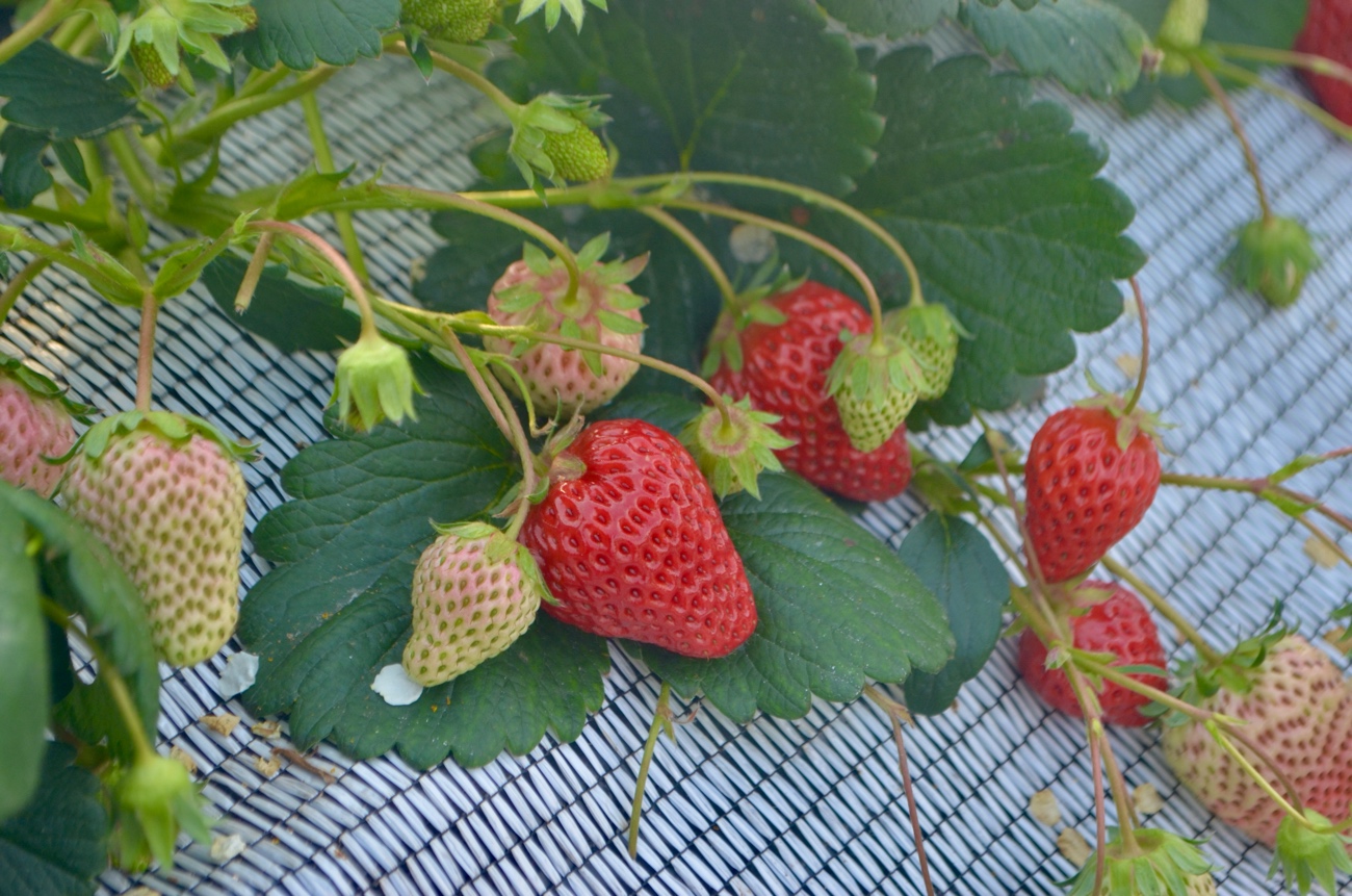 アスパラ畑の隅にあるちいさなハウスでは、最近栽培を始めたイチゴが実をつけ始めているというので、覗かせていただく。ハウスの中をミツバチが忙しそうに飛んでいる。イチゴは紅ほっぺという品種だそう。「好きなの採って食べてみてください。この辺りのやつが大きくておすすめですよ。」と田中さん。ひとつ採っていただく。ヘタのすぐ近くまで真っ赤なイチゴは、甘酸っぱくておいしい。