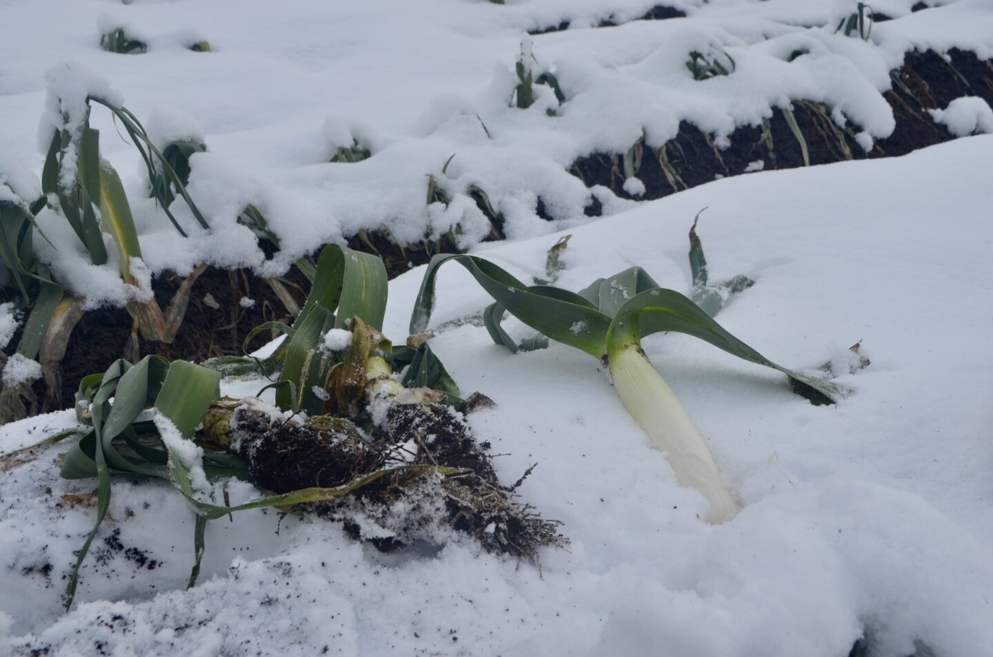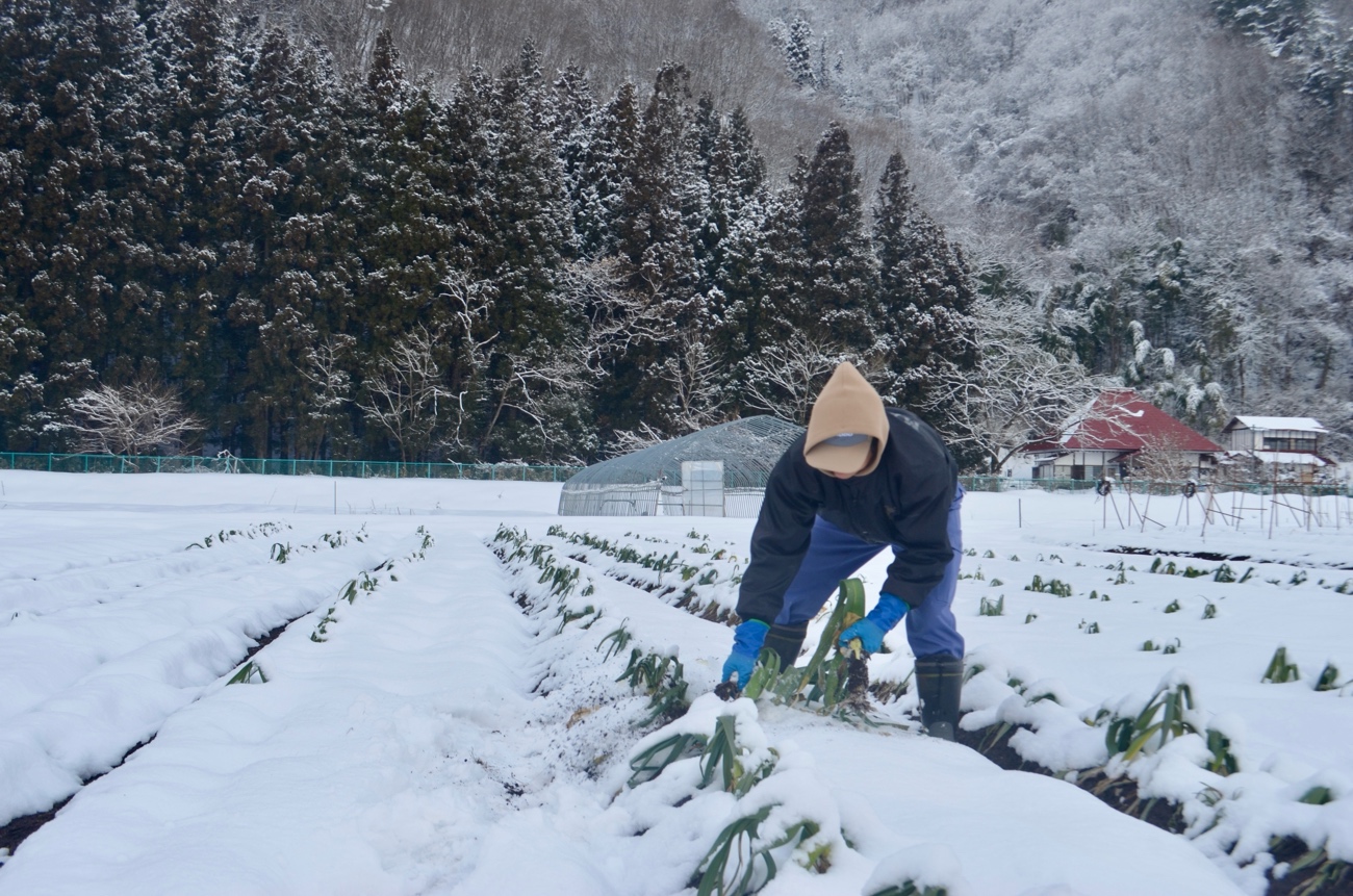 到着するとさっそく雪が積もった畑へ案内してくれた。畑にはネギのような野菜がずらり。雪の中から掘り起こす。ネギよりも太くて真っ白な茎が雪の中から現れる。